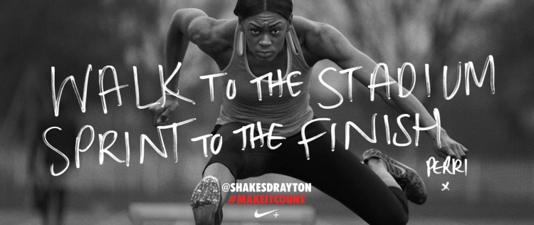An energetic, brave, black and white picture of athlete Perri Shakes-Drayton; rough and unpolished hand-written type (note – font); and heavy, contrast block font type, down at the bottom makes for a hard-hitting, inspiring and powerful design – one that summarizes and communicates all of Nike’s brand values graphically and instantly.