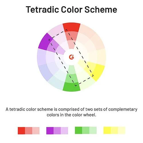 This is a richer and fuller colour scheme using two pairs of complementary colours and forming a rectangle on the colour wheel – which is why the scheme is called the colour rectangle. The vibrant and sharp contrasts of the Tetradic – or the double complementary – scheme are appealing to the eye because of the colourful look they give to your logo. This scheme is versatile in that it can be used to evoke a range of emotions and also allows you to select one – or two – dominant colours to align with your mission and vision statement as well as your marketing message.