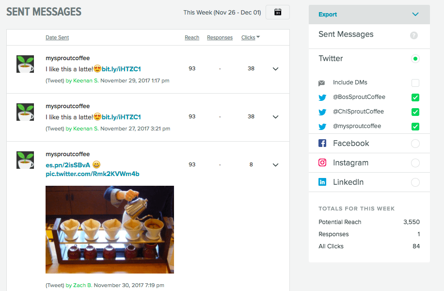 You can use Sprout Social’s sent messages report to see exactly which content of yours gets the most engagement across all of your channels. Once you’ve identified them, you can start sharing similar content.